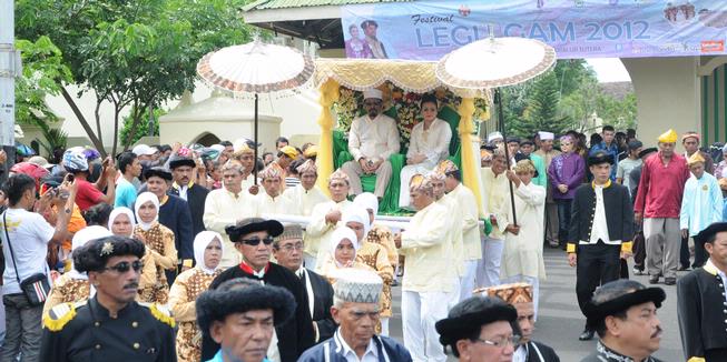KOMPAS.com/Anton Abdul KarimSultan Ternate Mudhafar Sjah bersama permaisuri Boki Nita Budi Susanti saat ditandu dari Kedaton Ternate menuju lapangan Ngaralamo Ternate, Minggu (1/4/2012) untuk mengikuti pembukaan Festival Legu Gam